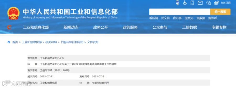 工业和信息化部办公厅关于开展2023年度绿色制造名单推荐工作的通知