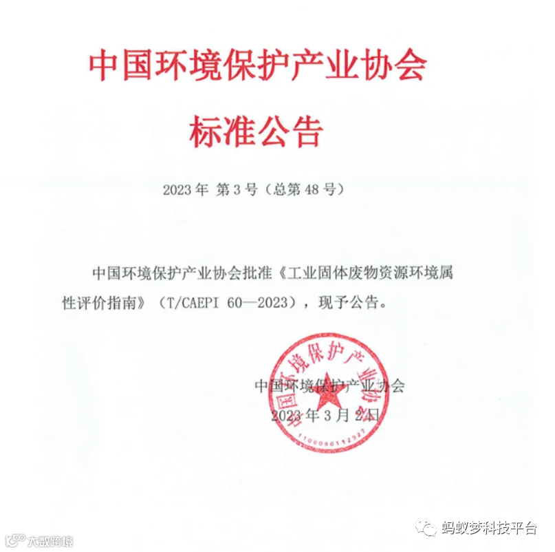 《工业固体废物资源环境属性评价指南》(T/CAEPI 60—2023)由中国环境保护产业协会固体废物处理利用专业委员会组织制定,中国环境保护产业协会 2023年3月2日批准发布,将于2023年4月1日起实施。