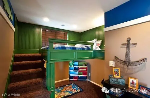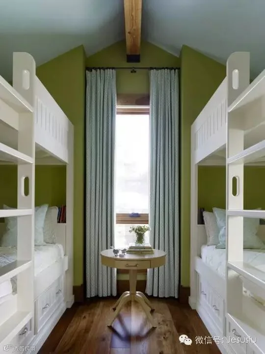 如果你也拥有军人情节,那么这个设计就非常适合你了。军绿色的配件、简洁的上下铺,满满的军中情怀。