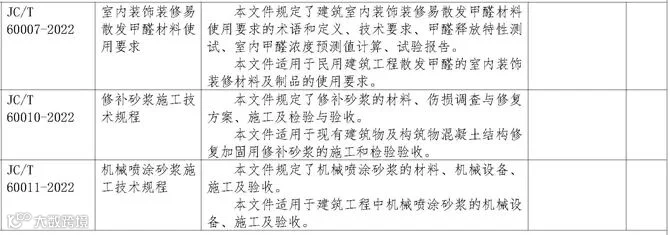 据介绍,3项建材行业标准分别为《室内装饰装修易散发甲醛材料使用要求(JC/T 60007-2022)》《修补砂浆施工技术规程(JC/T 60010-2022)》《机械喷涂砂浆施工技术规程(JC/T 60011-2022)》。
