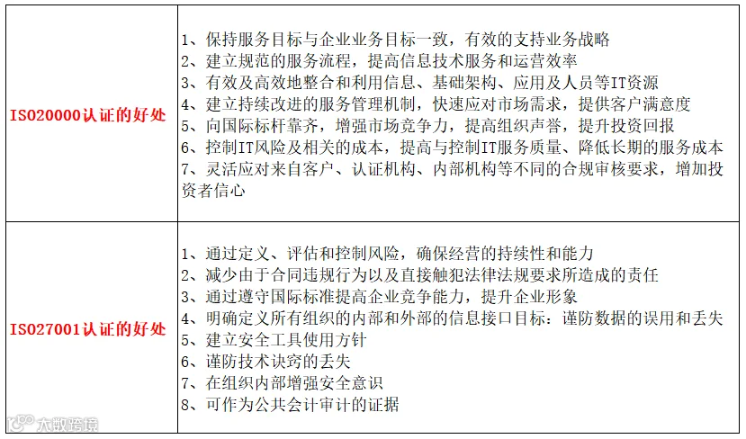 如:事件管理、业务连续性管理、信息资产管理等方面,大多数的企业都会选择将ISO20000 与ISO27001 认证项目一同实施,使两套体系间的互补特性得到充分发挥,更全面更规范的控制公司的服务运维体系与安全管理。