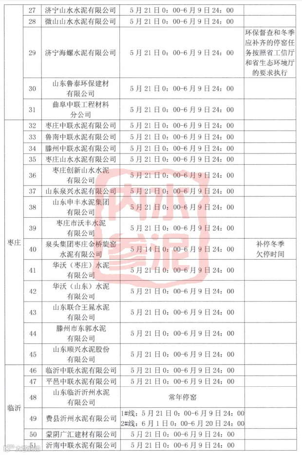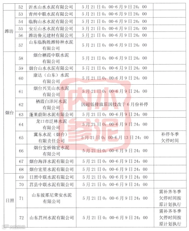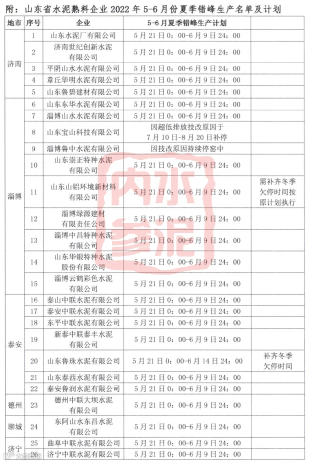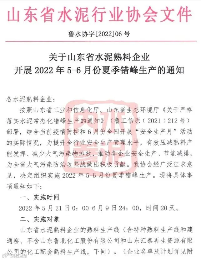 近日,山东省水泥协会发布了《关于山东省水泥熟料企业开展2022年5-6月份夏季错峰生产的通知》,以下为通知的主要内容: