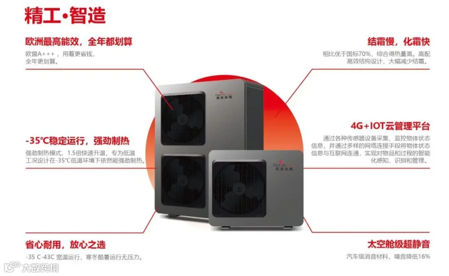 搭载进口松下变频EVI压缩机与喷气增焓技术,突破-35℃极寒限制,制热性能强劲澎湃,运行高效更静音。