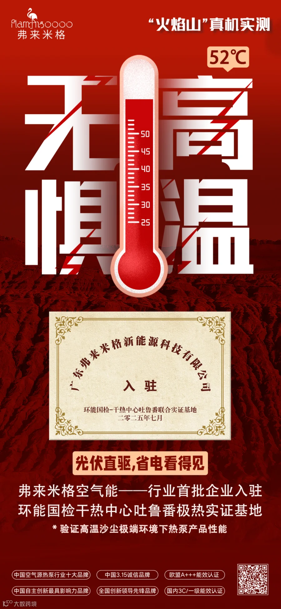 弗来米格空气能成功入选环能国检吐鲁番联合实证基地首批入驻企业名单,成为首批在这座被誉为现实版“火焰山”的严苛环境中接受检验的企业之一。