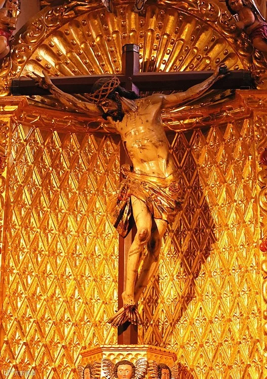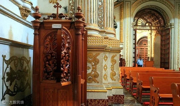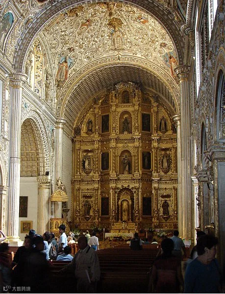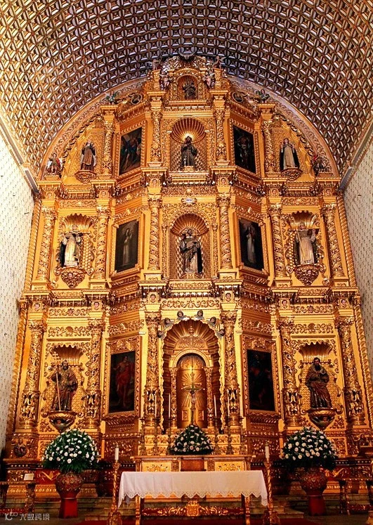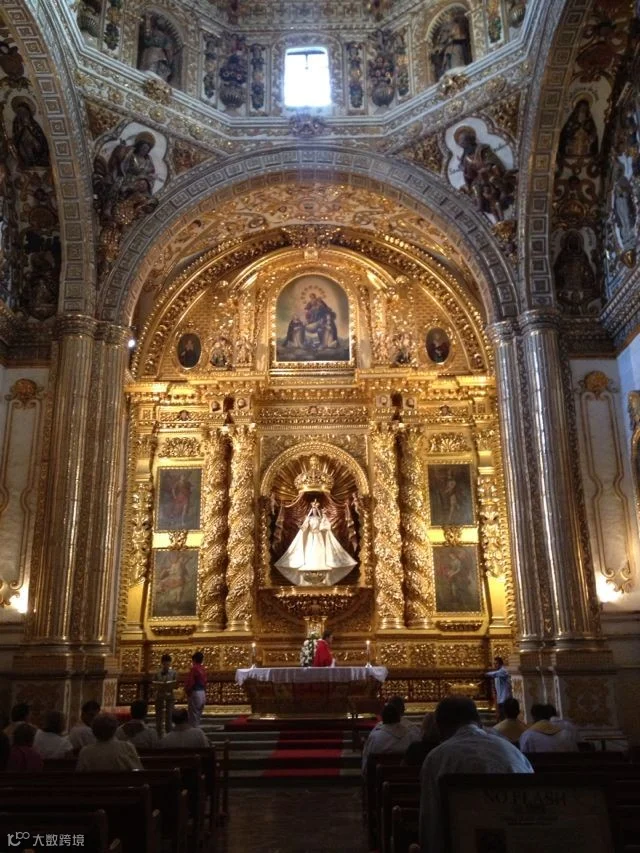 这种气质来源于圣多明各教堂的內部天花板和墙壁雕饰,其雕花之繁复,风格之贵气,一眼望去。尤其是那座大型镶金主坛,更是全墨西哥装饰最繁复最昂贵的主坛。