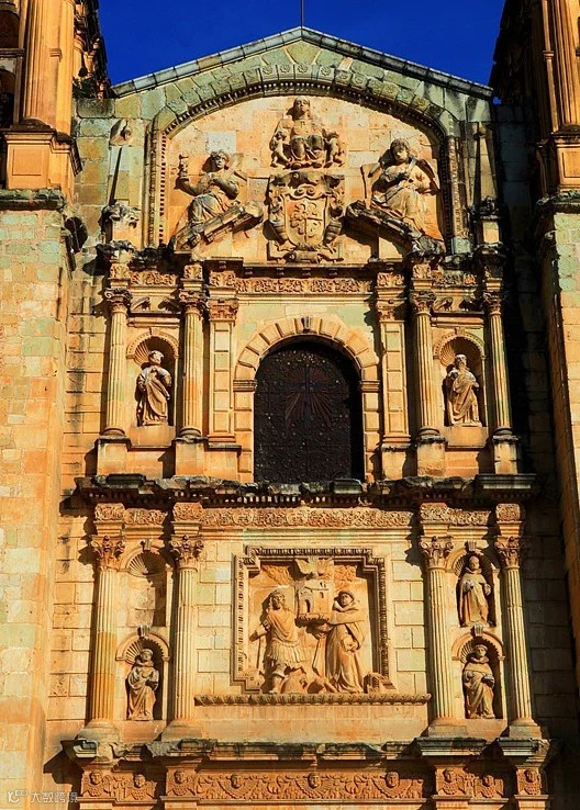 瓦哈卡古城历史街区里最著名的建筑无疑就是圣多明戈大教堂和修道院旧址,大教堂是一座艺术圣殿,建筑样式模仿西斯廷教堂,高耸华美、画栋雕梁。教堂前厅上方呈列着圣多明戈家族的人物谱,四周点缀着各种以圣徒、天使、宗教故事为主题的壁画。抬头仰望,圣母瓜达卢佩的祭坛位于前厅顶端,以6万片23.5克拉的金叶子镶嵌而成,美轮美奂,精妙奢华。
