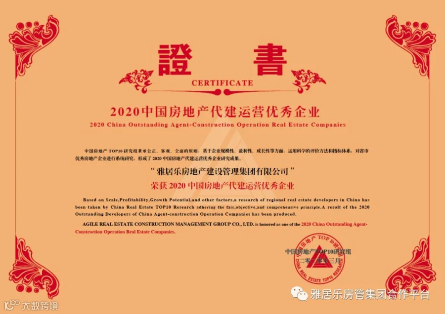 3月17日,雅居乐房管集团被中国房地产TOP10研究组授予“2020中国房地产代建运营引领企业”荣誉,位居代建运营优秀企业榜单TOP2。