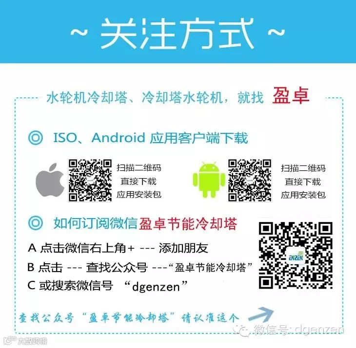 ☀ 定期推送盈卓公司冷却塔改造,水轮机冷却塔,无电机冷却塔,等诸多专业知识内容,专业冷却塔改造、100%节能省电!关注我们妥妥没错!(联系电话:400-622-3696)微信号:dgenzen