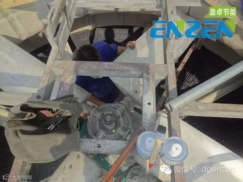 图为已安装好的水动风机冷却塔上的盈卓牌水轮机。