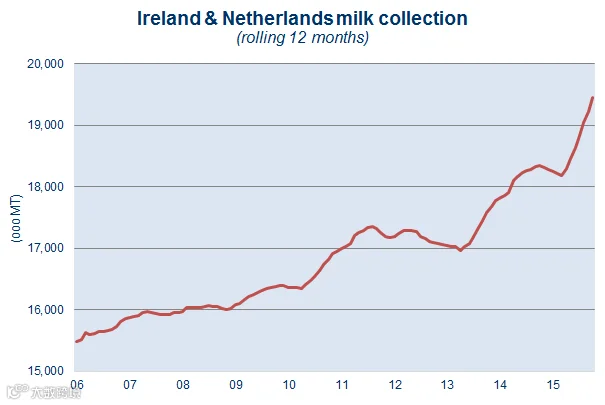 尽管在未来几个月内,爱尔兰放缓了增加额度,但随着国家进入淡季,欧盟的产量预计在2016年将继续增长。大多数预测称将比2015年增长0.8%到1.2%。增长预计将在爱尔兰保持特别强劲的趋势。爱尔兰农业与食品发展部——爱尔兰国家农业食品发展机构,计划让爱尔兰的牛奶产量将在2016年增加又一个7%的增值。