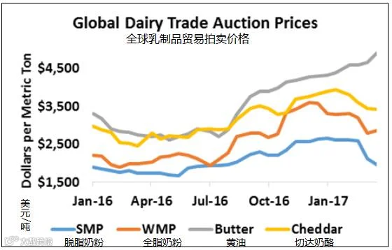 其他乳制品在周二的全球乳制品贸易中的表现差强人意。在恒天然集团宣布增加产品供应量后,切达奶酪价格下跌1%,脱脂乳粉(SMP)价格暴跌10.1%。欧洲和大洋洲的脱脂乳粉(SMP)的价格正在朝着欧盟的支持价格不断下跌;可能很快政府就会将其加入到他们已经很大的奶粉库存里。