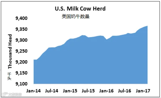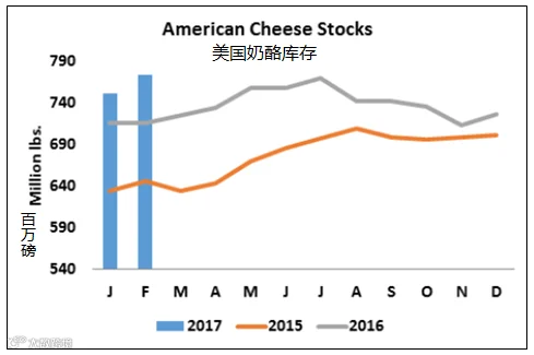 只要牛奶的产量仍不断增长,奶酪的产量就会持续攀升。今年2月又出现这种情况,特别是在一些生产奶酪的关键地区,美国牛奶产量与去年同期相比,涨幅为2.3%。美国农业部(USDA)估计奶牛数量将创20年来新高,达936.78万头,与1月相比增加4000头(与中介机构公布1月最初的乳牛数相比增加7000头)。目前美国奶牛数量比一年前增加了56,000头。