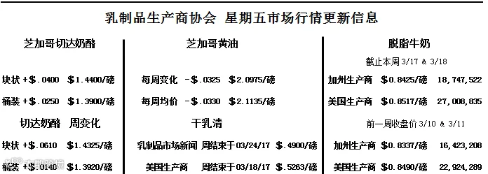 本周芝加哥商品交易所(CME)出现奶酪价格反弹。块状切达乳酪价格上涨4美分,收于1.44美元/磅。桶装切达乳酪上涨2.5美分,收于1.39美元/磅,价格仍然不尽人意。三级奶的期货价格在现货乳酪市场有相当高的溢价。本周的价格上下波动,但四月至七月的合同以亏损收场。延期合约价格则稳步稍微升高。