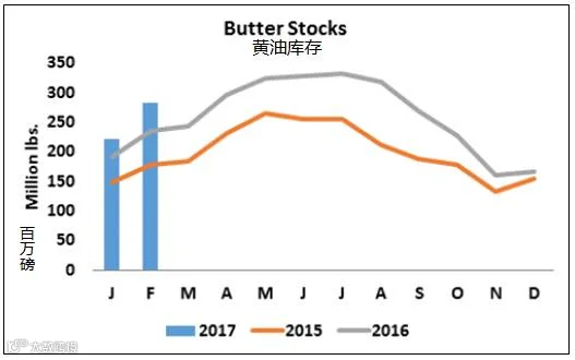 黄油等全脂乳制品依然受到世界各地消费者的喜爱,生产奶油的高峰期正快速逼近。但是需求并没跟上供应量快速增长的脚步。2月美国黄油的库存量急剧攀升6110万磅,达2.826亿磅,这是自1992年以来1月到2月的最大增长量。库存与去年同比涨幅高达20%,达24年来最大的2月库存量。库存仍在持续增长。根据乳制品市场新闻报道称:“奶油库存充裕。黄油生产商继续加工奶油生产黄油来履行合同并储存黄油,而不是把在现货市场中销售奶油。”因此,本周芝加哥商品交易所的黄油价格下跌3.25美分,收于2.0975美元/磅,是4个月以来最低价。
