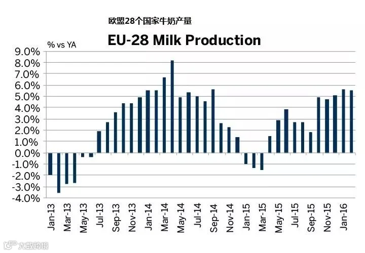 关于全球牛奶的产量从上个月开始就没有什么变化,因为在欧洲牛奶产量强劲增长的带领下,全球牛奶的产量继续保持在供大于求的状态。二月份,欧洲的牛奶产量比去年同期增长了5.5%。当然,由于接近2015年第一季度的牛奶产量,第一季度比年前从容。从5月份起,牛奶产量的百分比增长率预期将下降,因为随着配额的取消,2015年春季农民开始抑制奶牛旺盛的生产量。北欧国家继续带领产量的增长:爱尔兰(+32.3%)、卢森堡(+22.7%)、比利时(+20%)和荷兰(+17.5%)。葡萄牙、瑞典、法国和芬兰的牛奶产量较低。在一定范围内,欧洲牛奶产量的增长可被几个因素抑制,如下: