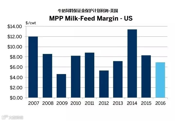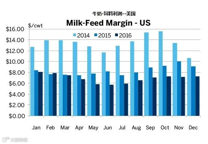 在过去的一个月里,粮食价格上涨,而牛奶价格下跌。因此,奶牛场的利润率已经下滑到几年来没有出现过的水平。他们虽然没有跌到2009年或2012年的水平,但最近的低迷使很多农场的利润为赤字。从理论上说,农民赔钱会减少生产。而实际上,农民倾向于在短期内推动更大的生产力以产生像以前一样的现金流。随着时间的推移,劣质奶剔除量增加,牛奶产量下降。但这一数学关系在美国变得复杂化,因为越来越多的农民使用饲料成本和牛奶价格的对冲工具。假设一个生产大部分牛奶的大农场,采用对冲策略锁定利润范围,在一定程度上,他们避免了低利润情况,就可以继续增加牛奶的产量。