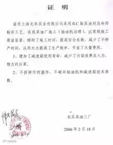 2006年2月经过一年的验证得到各采油厂好评,并办理了各油田入网证,成了中石油中海油中石化带压堵漏产品指定供应商,下图为长庆采油三厂开具的证明。从此开始了各油田石化燃气的带压堵漏产品销售、抢险施工、保运、技术培训等繁忙工作。这期间全国各地的化工、燃气、供水、热力暖气、冶炼、造纸、发电、消防、船舶也陆续将光本牌定为指定供应商。