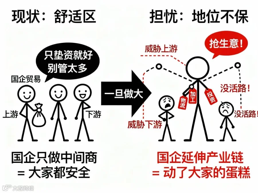 他们为什么反对国企贸易公司做大,往上下游延伸?他们怕一旦这些国企做大了,自己的地位就不保了,他们就想国企傻傻的,在贸易中只垫资就行了。