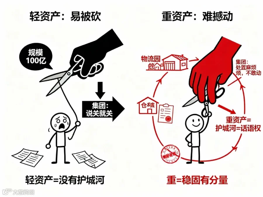 第一,轻资产绑架不了集团。你做的再大,如果都是轻资产,集团说关就关了。但如果你有大量的重资产,比如物流园、仓库、股权投资等,集团就不能随便动你了,因为这些资产处置起来很麻烦。