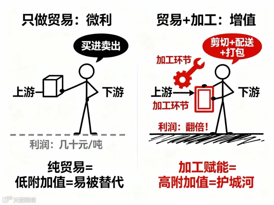 比如,你做钢材贸易,如果只是买卖钢材,利润可能就几十块钱一吨。但如果你能做钢材的剪切、配送、打包,利润可能就能翻倍。