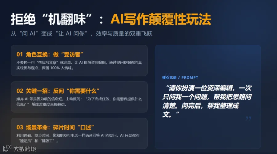 你是不是也有这种感觉: 费劲巴拉敲了半天字,AI 吐出来的东西,食之无味,弃之可惜。 全是正确的废话,一眼就能看出是“机翻味”。
