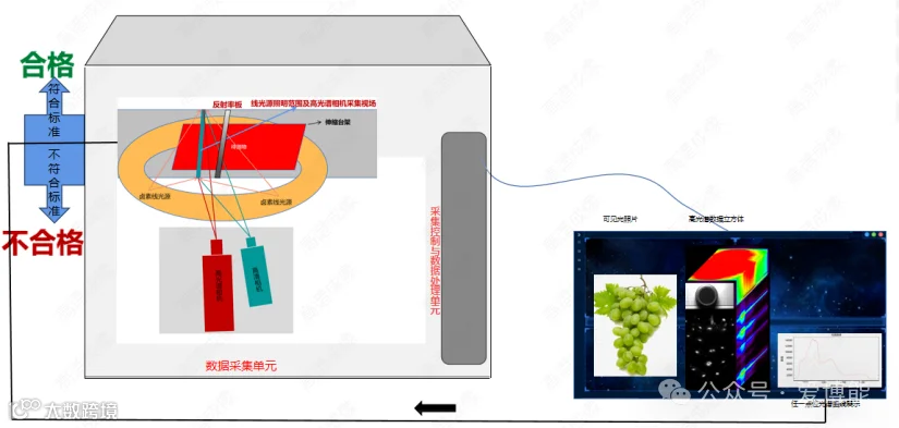 采集到的高光谱数据和可见光图像传输到采集控制和数据处理单元内,通过上位机软件进行控制与处理。根据待测物不同,提前验证算法进行建模,数据处理单元可实时对待测物进行物质成分的检测分类。