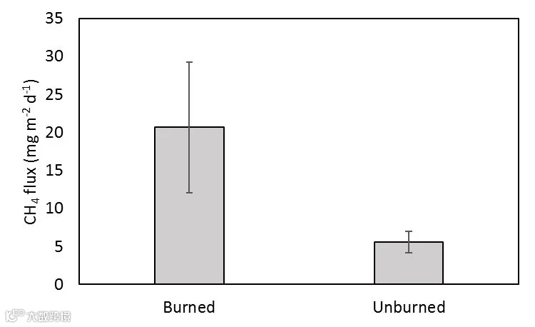 图5 每个站点的平均CH4通量(±SEs),在燃烧的站点收集了大约36个测量值,在未燃烧的站点收集了27个测量值。