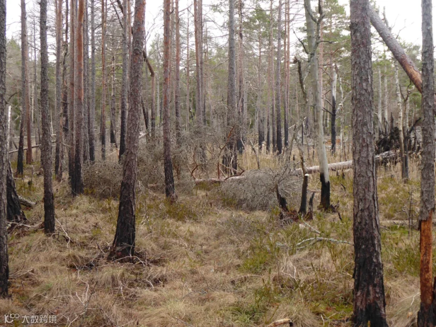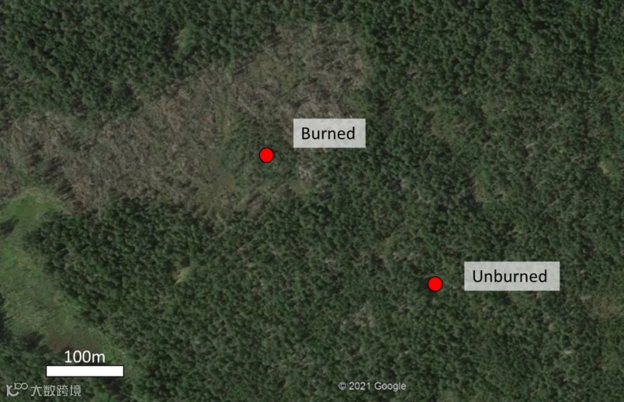 选择了两个小的泥潭进行测量,它们距离最近的道路到森林有1.5公里。被烧毁和未被烧毁的地点相距约400m(图2),并且在大火之前具有相似的特征(处理有开放的湿润区域,主要由泥炭藓,大戟草和杜鹃花等灌木组成)。火灾发生在2017年,原因是一场森林大火。