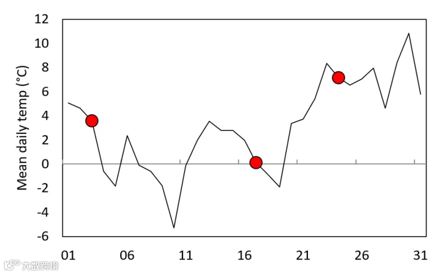 图1 2021年3月日平均气温曲线图(SMHI数据)。采样日期用红色圆圈标记。