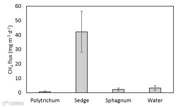 在采样过程中,夜间温度在不同的时间点降至冰点以下(图1),这可能导致池底沉积物太冷而无法产生甲烷。然而,来自莎草的甲烷排放表明甲烷的产生正在发生。在泥炭的更深处,植被和土壤有可能充当绝缘体,从而使温度更高,更稳定。如果这样的话,莎草可以将沉积物中产生的CH4输送到大气中。或者,水可能只是使沉积物保持低温,从而阻止了甲烷的产生。