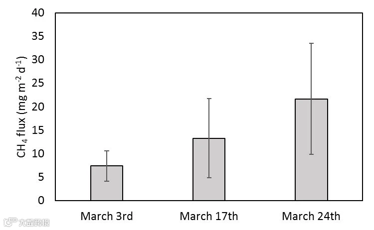 3月底日平均温度达到最高点时,所有采样区的平均CH4通量也最高(图4)。这并不奇怪,因为温度升高有利于产甲烷。