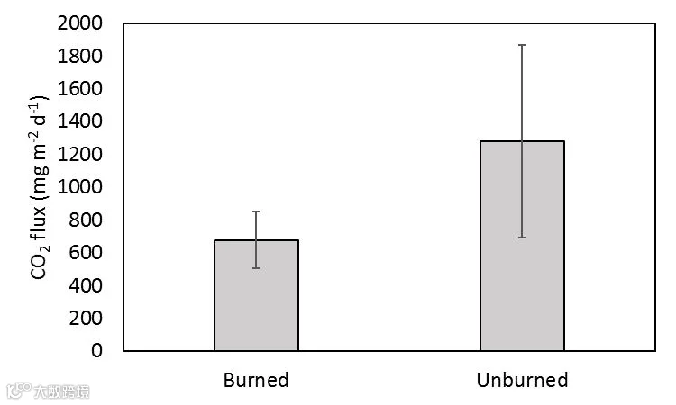 图 8 每个站点的平均CO2通量(±SEs),在燃烧的站点收集了大约36个测量值,在未燃烧的站点收集了27个测量值