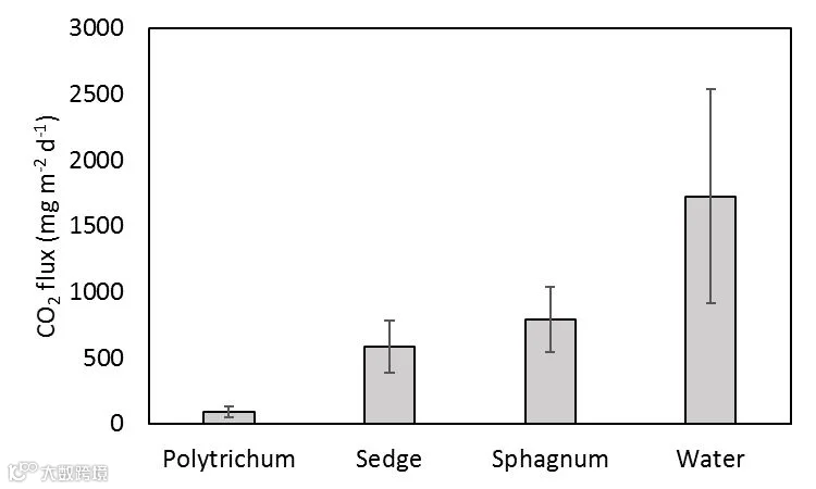 二氧化碳通量随植被类型/微生环境的变化而变化,并且在开放水域中最高(图6)。预计开放水面的CH4通量会更大,因为这些水池通常排放量很高。相反,这些池是二氧化碳的主要来源。
