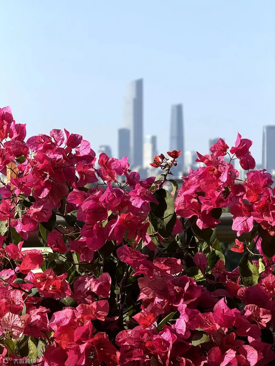 朝阳饱满,鲜花盛放,玫红和淡蓝色的天空形成对比,中间簇拥着象征着希望的广州地标东塔和西塔,展示着蓬勃向上的广州。