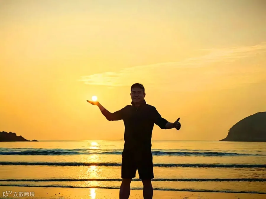 余晖倾洒,海滩如镀金光。他立于天地间,身影被夕阳勾勒。左手轻托落日,似握住岁月的温柔;右手竖起拇指,是对这美好瞬间的赞许。海浪轻拍,远处岛屿朦胧,他是此刻的时光旅人,与山海、落日共绘诗意篇章。