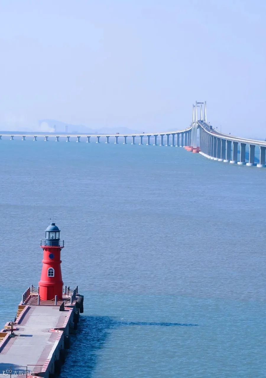 红色灯塔静立在栈桥之端,宛如海上明珠。远处南澳大桥如巨龙横卧碧波,从汕头市澄海区延展至南澳岛 。它是广东首座跨海大桥,结束了南澳岛与大陆依靠舟楫往来的历史 。蓝天、碧海、红塔与长桥相互映衬,主航道桥墩防撞体的红色和灯塔红形成对角线呼应。既展现着自然的壮美,也诉说着交通基建带来的发展新貌。