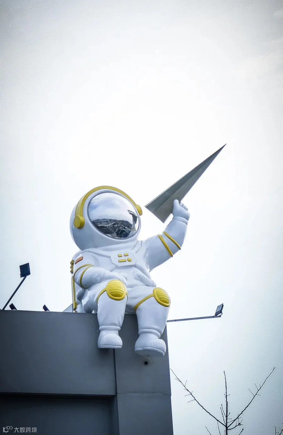 一位身着洁白宇航服、饰有明黄线条的宇航员雕塑,惬意坐于建筑顶端。他手持纸飞机,似要将心中的航天梦想与童真遐思,寄往无垠天际。在灰白天空的映衬下,雕塑散发着对宇宙探索的热忱与向往。