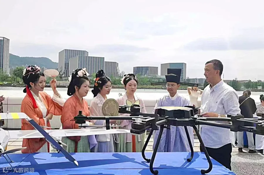 身着传统汉服的佳人雅士,眸光流转间满是好奇与惊叹,围聚于先进的无人机旁。当古韵华裳邂逅现代科技,一场奇妙的对话在城市河畔开启。