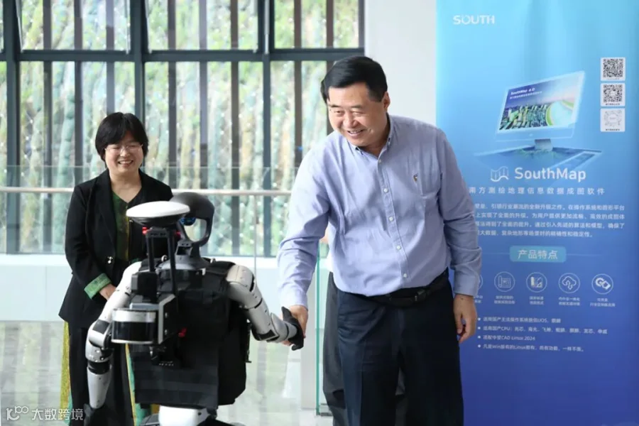在明亮的室内空间,人与科技的温情互动悄然上演。一位男士面带微笑,伸出手与智能机器人相握,似在开启一段全新的友谊篇章。