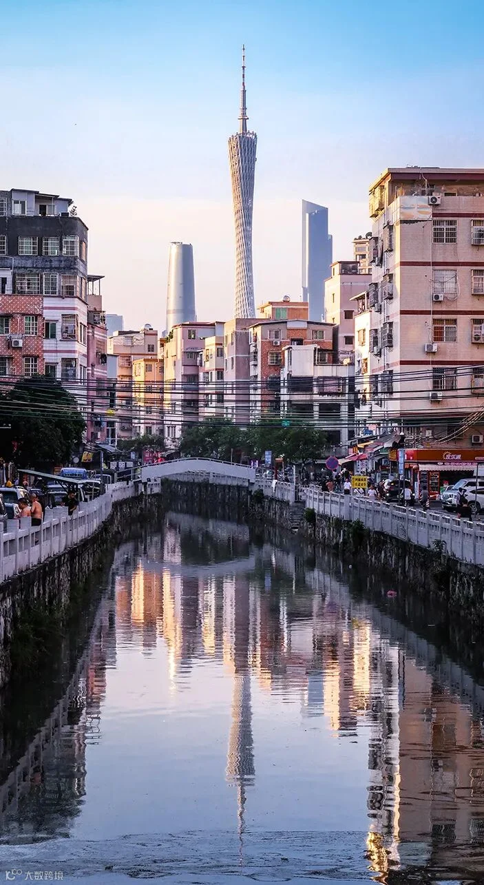 远处广州塔 “小蛮腰” 身姿绰约,倒映于水中,与城中村市井烟火相融。城中村是城市的旧梦,现代都市则是蓬勃的新篇,它们相互依偎,共同编织出这座城市独有的纹理。