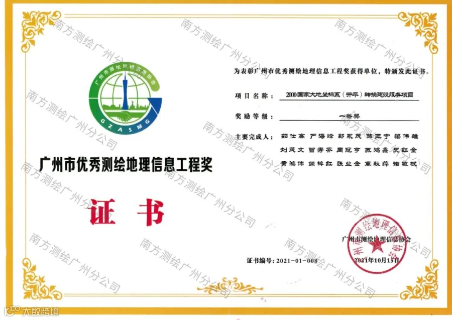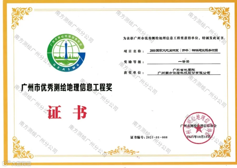 经广州市测绘地理信息协会评审,南方测绘广州分公司参与的“2000国家大地坐标系(开平)转换建设服务”项目荣获2021年度广州市优秀测绘地理信息工程一等奖。此次获奖证明了南方测绘广州分公司积极响应国土资源部通知精神,为“按条例规定保留一套全市统一的坐标系,保证开平市地理信息数据基准一致性”作出了重要贡献。