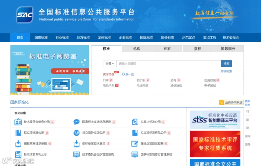 三、申报人员应认真详细填写申报信息,确保信息准确无误;审评中心对专家申报信息进行审核并决定是否聘请,对聘请的专家统一纳入专家库管理,同时对所有申报信息进行保密。申报方法可登录 “全国标准信息公共服务平台”(http://std.samr.gov.cn/)点击右下方的 “国家标准技术审评专家征集系统” 红色图标,进入系统进行申报。