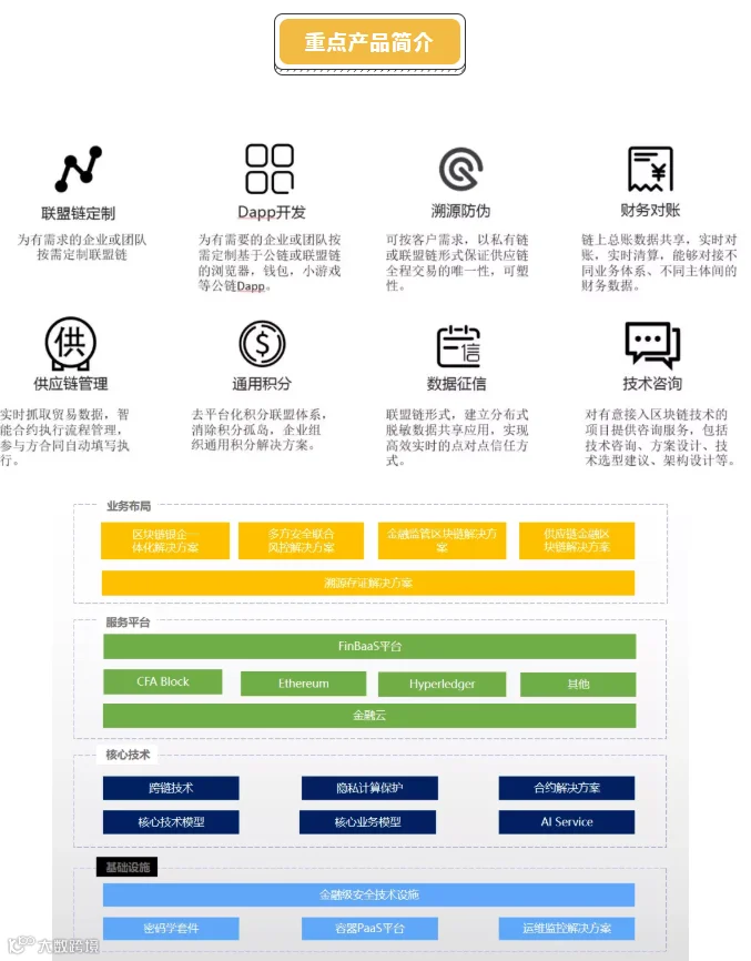 数信区块链拥有国内一流的区块链技术研发、大数据平台构建和数据分析挖掘建模的技术团队,处于国内区块链技术研究及实际应用的领跑者,具备丰富的开发和项目实施经验。我们基于公司自主研发的独有共识算法等专利技术,为客户提供稳定的底层基础设施、通用的业务平台组件,并能够针对特定的业务需求,开发定制联盟链、DApps等。公司业务广泛覆盖防伪溯源,供应链管理,通证积分设计,区块链技术咨询服务等领域,目前已经开发和拥有了金融监管区块链平台、金融(风控)大数据平台等成熟产品服务。