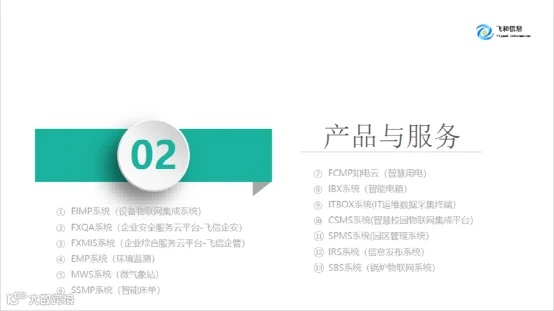 自主知识产权产品:设备物联集成管理平台EIMP(智慧医院、智慧园区、智慧校园)、知电云、飞信企安等。
