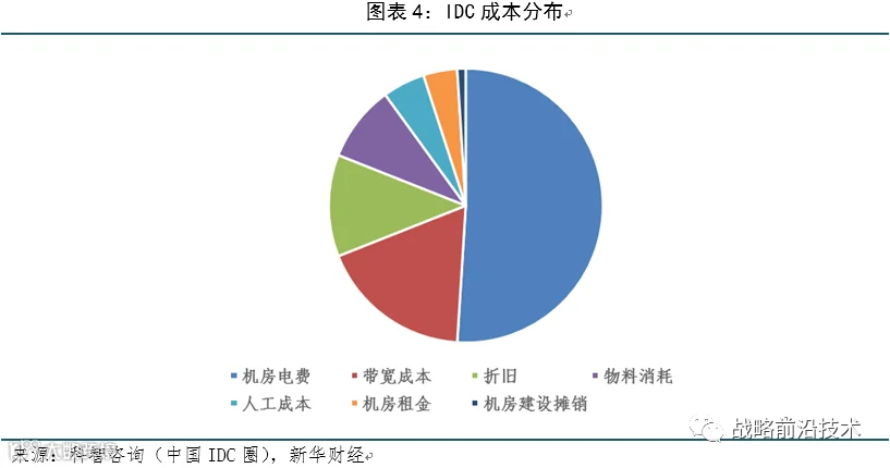IDC基础设施取决于厂商自身的规模化建设、管理能力,并受土地、电力等产业要素影响。机房电费占据IDC总成本的一半,其次是带宽成本和折旧费用。服务器等IT设备、空调、通信电源转换耗电占比接近。机房电费受制于PUE(有效能耗比)和地区电价。所以,地理环境带来的电费差异是机柜安置首要考虑因素。华为、阿里、腾讯、苹果中国的大数据中心都设在贵州。贵州地貌以高原山地为主,全年温度适宜,水电充沛,电费较低。华为大数据中心落地贵州,一年仅电费开支就可节省6亿元。至于带宽成本,具备数据中心与带宽接入一体化服务能力的运营商可以提高使用效率,从而控制带宽成本。而折旧费用、物料消耗、人工成本,这取决于厂商是否具备规模化建设和管理能力。