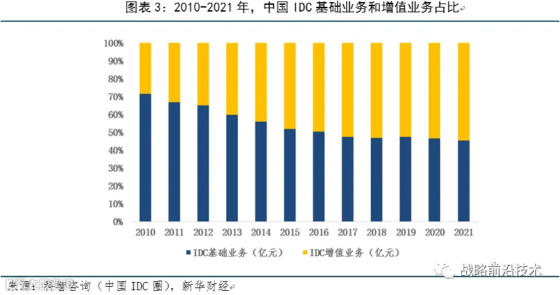从业务结构来看,IDC增值业务(网络安全、数据应用、运维)迎头赶上,与基础业务平分秋色。三大运营商占据IDC市场七成以上,凭借带宽资源和全国客户,不改长期竞争优势。第三方IDC厂商多样化增值服务与快速技术迭代能力凸显,未来市场占比有望提升。
