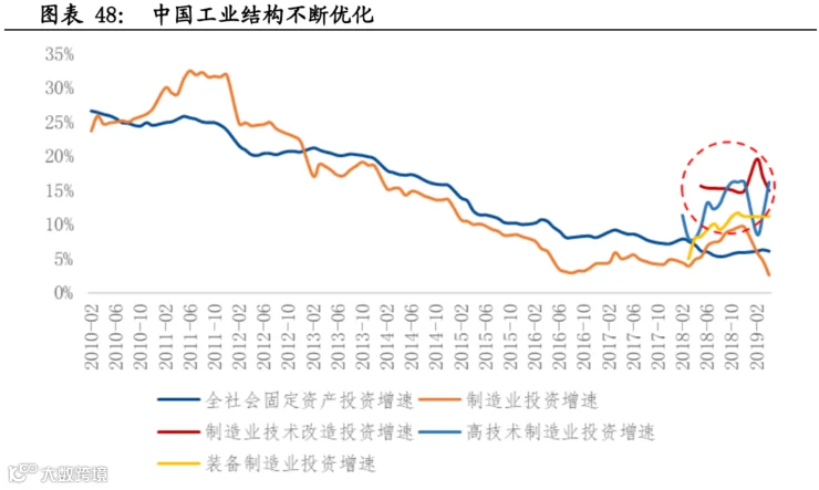 中国将迈入后工业化时代,工业结构不断优化,高端制造产业投资占比将不断提升。目前中国已进入到工业化后期向后工业化时代过渡的阶段,全社会固定资产投资增速放缓,中国经济发展已经由要素驱动、投资驱动向创新驱动转变,带来中国工业结构不断优化。2019 年之后,制造业投资增速回落,1-4 月份制造业投资同比增长 2.5%,增速比一季度回落 2.1 个百分点。制造业投资增速虽有所回落, 但高技术制造业投资和制造业技术改造投资分别增长 11.4%和 14.9%,高于全部 制造业投资 8.9 个百分点和 12.4 个百分点,高端制造业占比将持续提升。