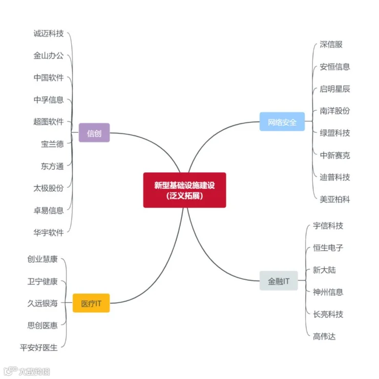 泛义的新基建:信创、网络安全、医疗 IT、金融 IT 等。