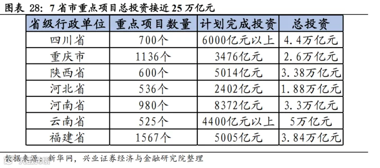 自 2020 年以来,已有 25 个省市的政府工 作报告提及新型基建,其中 8 个地区明确规划了年内计划新建 5G 基站的数量, 合计超过 30 万个。四川、重庆、陕西、河北等省市已发布了年度重点项目清单, 总投资接近 25 万亿元,计划完成投资也接近 3.5 万亿元。自决策层吹风到地方政府的跟进,自上而下地推进新基建。