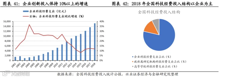 近年来,我国企业逐步转向创新驱动发展,培育利好新基建的产业环境。全国科技经费投入统计公报表明,2018 年各类企业研究与试验发展(R&D)经费 15233.7 亿元,比上年增 长 11.5%。从 2018 年全国科技经费投入结构来看,企业科技经费投入占比高达 77.4 %。对研发投入的高度重视,表明我国企业正逐步转向创新驱动发展,培育出利好新基建的产业环境。